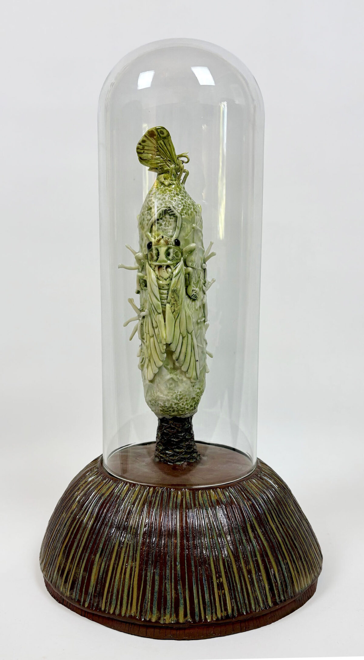 Porcelain flower on mahogany clay base with glass cloche 32 cm high x 16 cm diameter