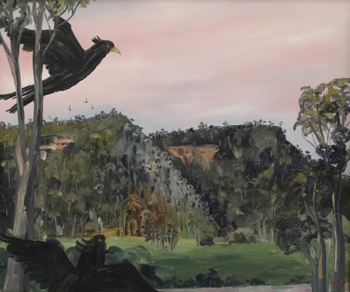 In ‘Eurotipodes - Colonial Capsize’ a semitransparent horse hangs upside down, merged with a kangaroo in a red colonial landscape. The diaphanous layered landscape reimagines colonial paintings from the Mitchell Library, referencing time, ecological and cultural change. Two iconic creatures are joined. In this work Glynn is reflecting on what is an ‘Australian’ landscape?