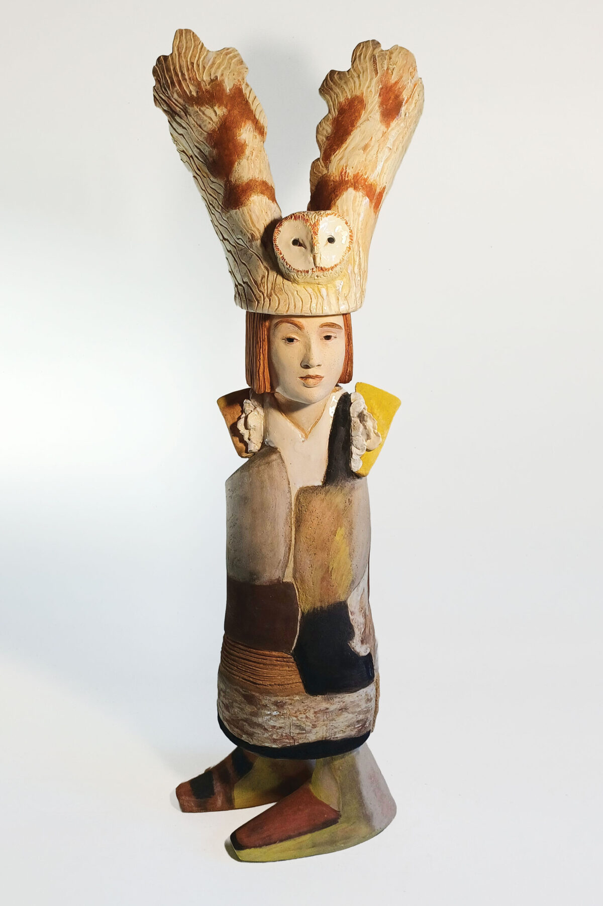 multiple clay types, oxides, glaze, fired to 1100 degrees C 70 cm tall It is our privilege to experience the wilds still existing along the eastern coast of Australia, within forests holding tenuously when left alone Identifying with the place where I live, the hooting of owls could be the most poignant of night sounds that I will protect with all in my power.