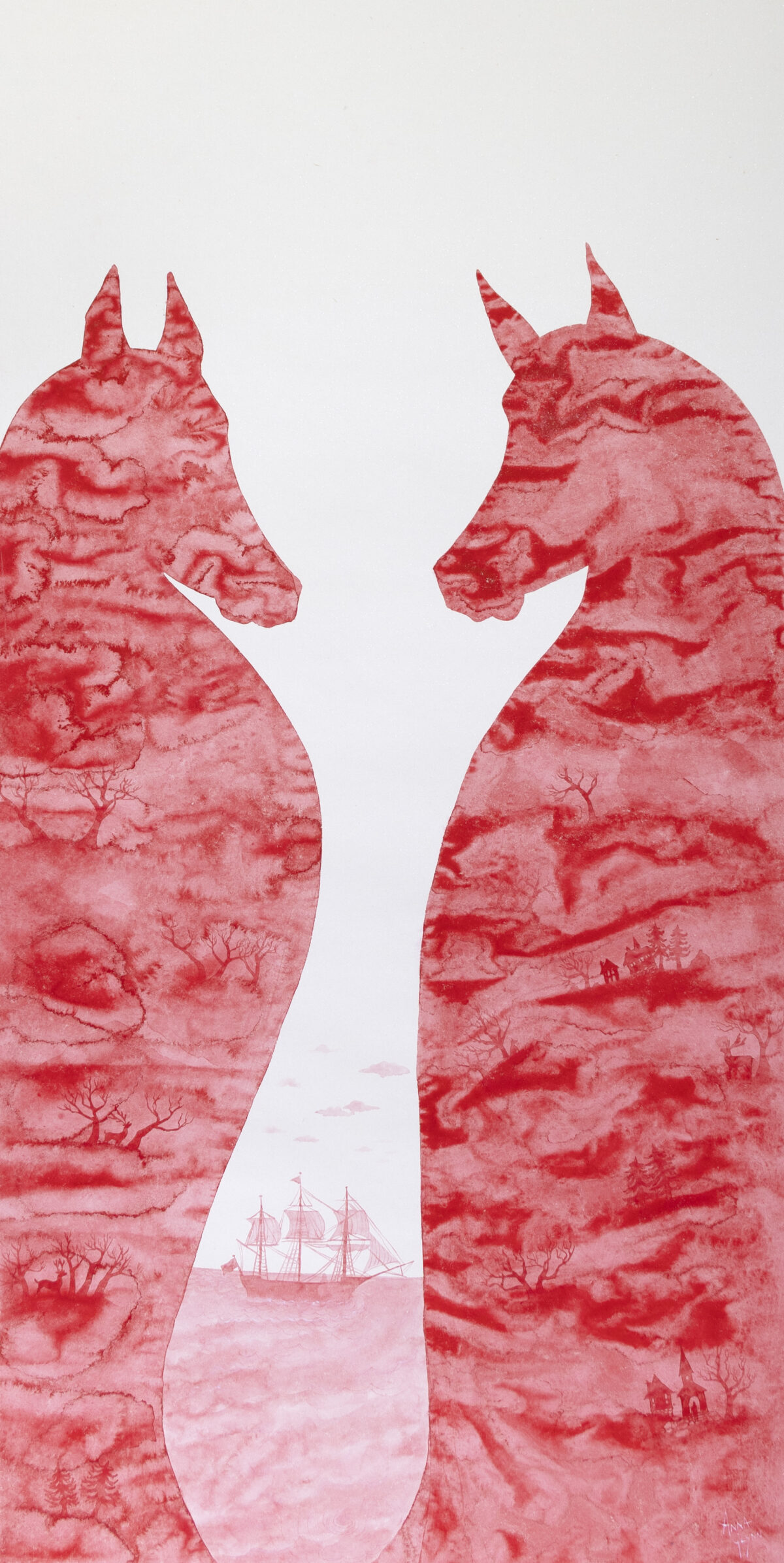 In ‘Eurotipodes - Colonial Capsize’ a semitransparent horse hangs upside down, merged with a kangaroo in a red colonial landscape. The diaphanous layered landscape reimagines colonial paintings from the Mitchell Library, referencing time, ecological and cultural change. Two iconic creatures are joined. In this work Glynn is reflecting on what is an ‘Australian’ landscape?