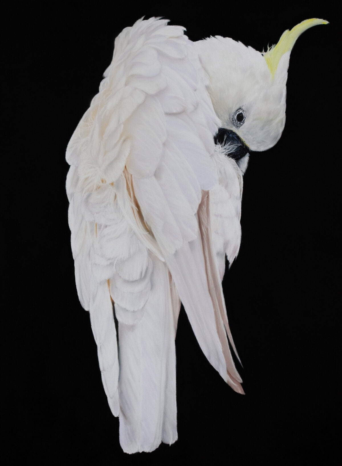 Sforzando denotes a sudden, emphatic musical accent, a note that insists on being heard. In this painting, the emphasis is translated visually through extreme contrast and isolation. The cockatoo, poised and self-contained, stands almost monument-like against the void. Despite the species’ reputation for raucous sound, this work considers another form of intensity: the power of contained presence. Silence can be confrontational. Silence becomes the loudest response.